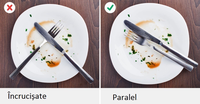 9. Cum așezi tacâmurile pe farfurie după ce ai terminat de mâncat?