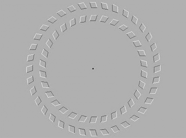 Uită-te cu atenție la punctual negru din centru, apoi mișcă-ți ușor capul înainte și înapoi. Dacă te uiți iar la imagine, vei vedea cercurile exterioare rotindu-se în direcții diferite.