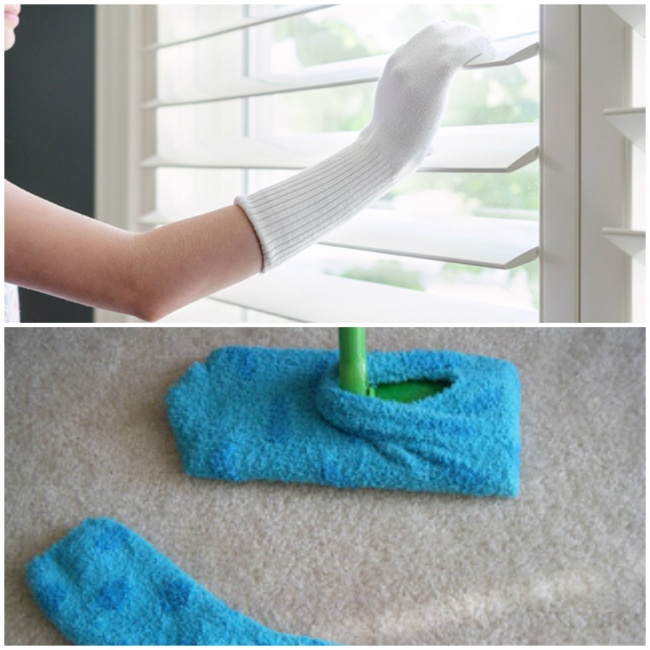 Dacă îți bagi o șosetă veche pe mână, poți curăța rapid jaluzelele, iar dacă o pui pe un mop, va fi mai ușor să scapi de praful de sub pat și de sub mobilă.
