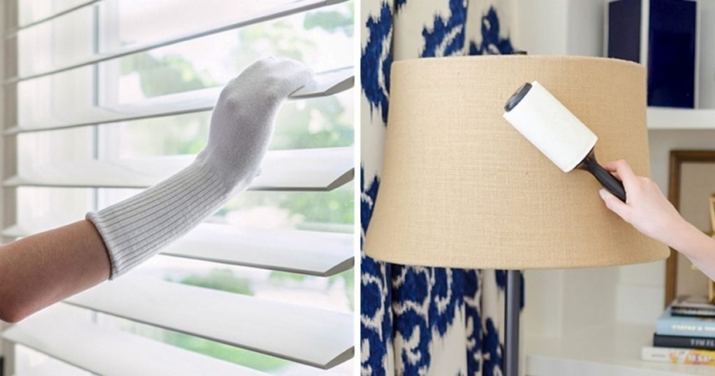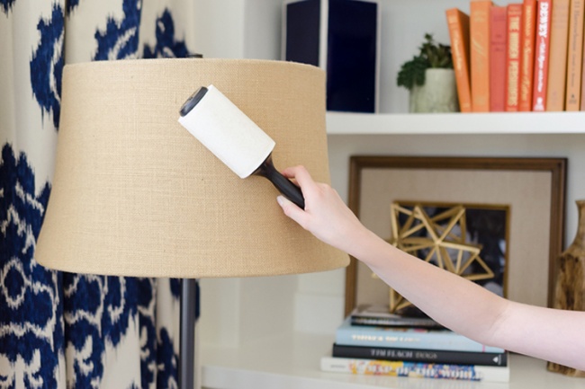 O rolă cu suprafață adezivă e bună ăentru a curăța abajurul, pernele decorative și alte materiale.