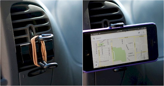 Să-ți folosești telefonul cu o mână, încercând să miști volanul cu cealaltă poate fi extrem de periculos. Folosește niște agrafe și un elastic de cauciuc pentru a-ți prinde telefonul în locul pentru aerul condiționat.
