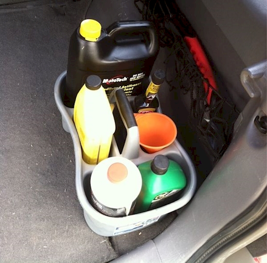 Poate fi puțin periculos să ții diverse lichide în mașină. Aranjează sticlele într-o cutie.