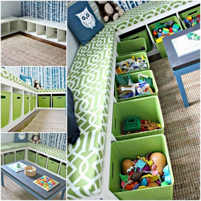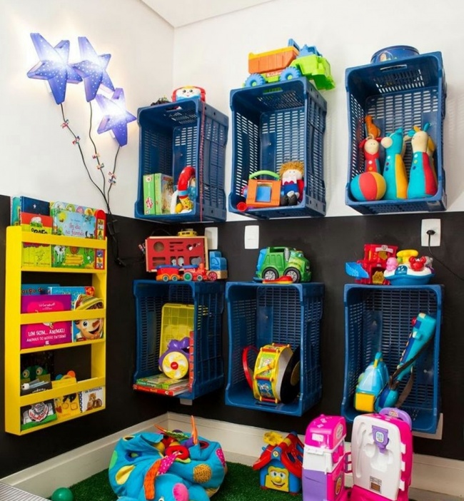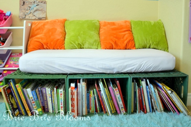 Folosind coșuri de plastic, copilul tău poate avea în cameră o canapea confortabilă și o întreagă bibliotecă.