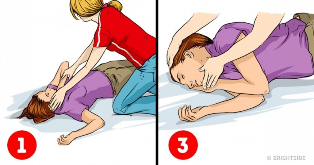 Înclinați ușor capul persoanei – gura se va deschide ușor pe măsură ce faci acest lucru. Ridica bărbia și asculta dacă persoana respira. Verifica respirația timp de 10 secunde. Îngenunchează în jos lângă persoana respectivă și muta-l de partea lor, punând o parte sub obraz. Important: dacă bănuisti o afectiune a coloanei vertebrale, nu mișca persoana. Deschide-i ușor gura fără a-i mișca gâtul.