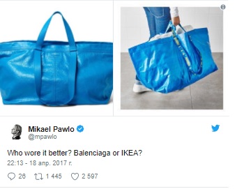 La începutul anului, în colecția brandului Balenciaga a apărut o geantă albastră în valoare de aproape 2.000 de euro. Oamenii au observat că aceasta era identică cu sacoșa albastră de la Ikea.