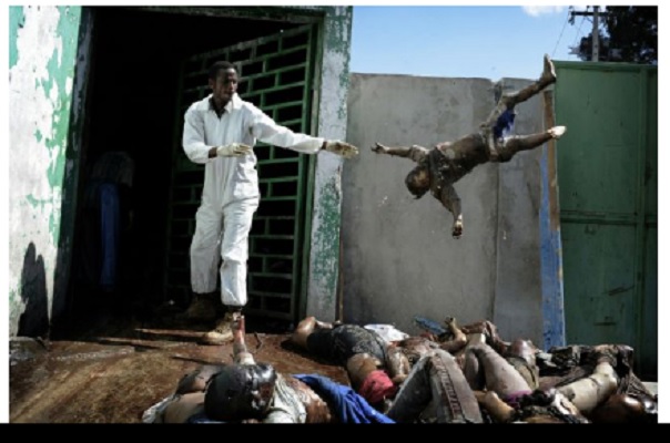 Această fotografie arată cum un copil mort este aruncat în ceea ce a devenit morga de rezervă din Haiti în 2010.