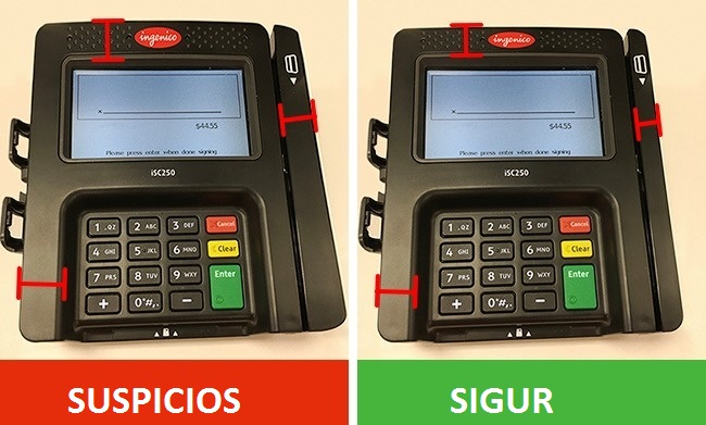 Toate terminalele ar trebui să aibă atașat un ac imprimatur cu care clienții să se poată semna după ce le-a fost scanat cardul. Un cititor fraudulos nu permite atașarea unui astfel de ac în iSC250.