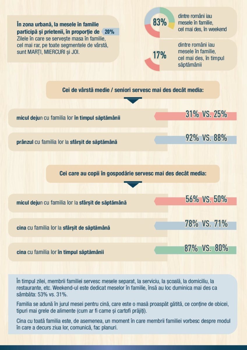 Studiul a fost desfășurat cu sprijinul agenției ISense Solutions în două etape: cantitativă și calitativă. Componenta cantitativă a cuprins un eșantion de 640 respondenți cu reprezentativitate națională (urban 67% & rural 33%), cu vârste cuprinse între 18 și 65 ani (50% bărbați/50% femei). Numărul mediu al membrilor din familie a fost de 3 persoane, iar numărul mediu al copiilor din familie este 1. În cadrul componentei calitative a fost realizat un jurnal pentru a documenta online timp de 7 zile, mesele a 6 familii (3 familii din mediul urban și 3 familii din mediul rural), utilizând o aplicație mobilă – Indeemo – pentru a explora și înțelege prin imagini și clipuri video cum se desfășoară mesele lor în familie.