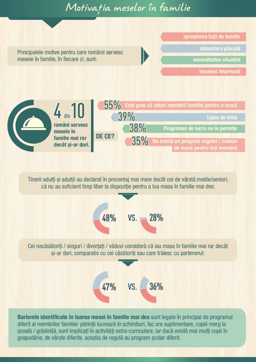 Același studiu realizat de Delikat arată că 4 din 10 români iau mesele în familie mai rar decât și-ar dori. Dacă ar fi după mine, eu aș prefera să fim împreună la toate mesele, deci sigur mă încadrez și eu printre ei. Motivele pentru care ajungem să facem asta sunt de multe ori independente de voința noastră. Printre principalele impedimente pe care le-au invocat românii: 55% cred că este greu ca fapt general să aduni membrii familiei la masă, în timp ce 39% au spus franc că timpul nu le permite.