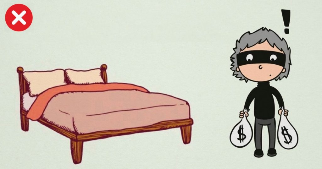 Deși a devenit ceva clasic, nu te gândi că e o idee să-ți ții banii sub saltea doar pentru că dormi pe ea. Când nu ești acasă, acolo vor căuta hoții prma dată.