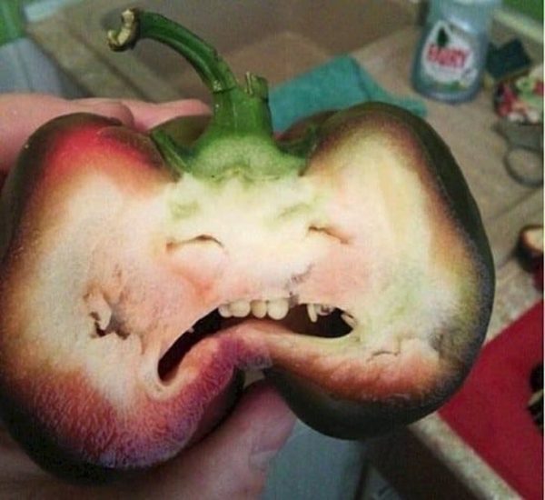 Asta da surpriză… Să vrei să-ți faci o salată și să dai de o fățucă de ardei trist. Interesantă așezare a semințelor…