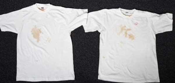 Aceste 2 tricouri albe identice au fost pătate cu vin, ketchup, ruj, iarbă și fond de ten. Pentru spălarea lor, s-au folosit 2 detergenți diferiți, care promit aceleași rezultate.