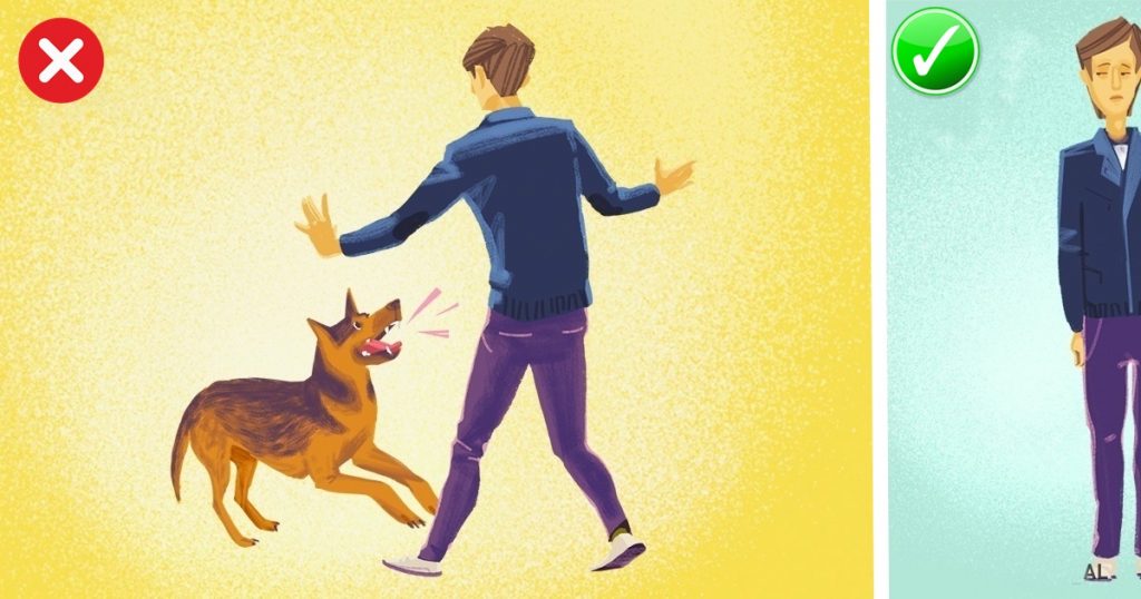 Deși e greu să rămâi calm când un câine agresiv latră la tine, dacă țipi, îți miști brațele sau fugi îi declanșezi instinctual de prădător și îl provoci să atace. Câinii și alte animale simt frica.