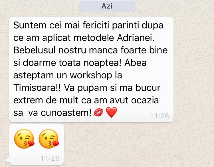 Îi mulțumesc Adrianei, care s-a implicat foarte mult în acest proiect. Mămicile au fost cucerite de ea și de felul ei direct de a spune lucrurile. Multe i-au spus că totul pare ușor atunci când ea explică sau face ceva, că e ca și când ar avea o baghetă magică, dar vă garantez că nu are. Principalul secret atunci când vine vorba de a pune în aplicare aceste tehnici este răbdarea. Multă răbdare și perseverență, iar toată magia ei stă în dragostea pe care o are pentru bebeluși și în experiența de 15 ani din America. Mie mi-a schimbat viața atunci când am adus-o acasă pe Alesia și mă bucur că a avut acum ocazia să împărtășească trucurile ei cu mai multe mămici din România.