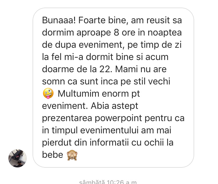 Le mulțumesc din suflet tuturor mămicilor care au fost alături de noi în cele 3 zile, Adriana le-a dat numărul ei de telefon și le încurajez și eu să îl folosească cu încredere ori de câte ori au nevoie de un sfat și le doresc să aibă parte de bebeluși cât mai fericiți și liniștiți. Multe dintre ele mi-au scris după eveniment și mi-au povestit că au pus în practică sfaturile încă din prima seară și funcționează neașteptat de bine. Pentru noi, acest feedback a fost cea mai mare bucurie.
