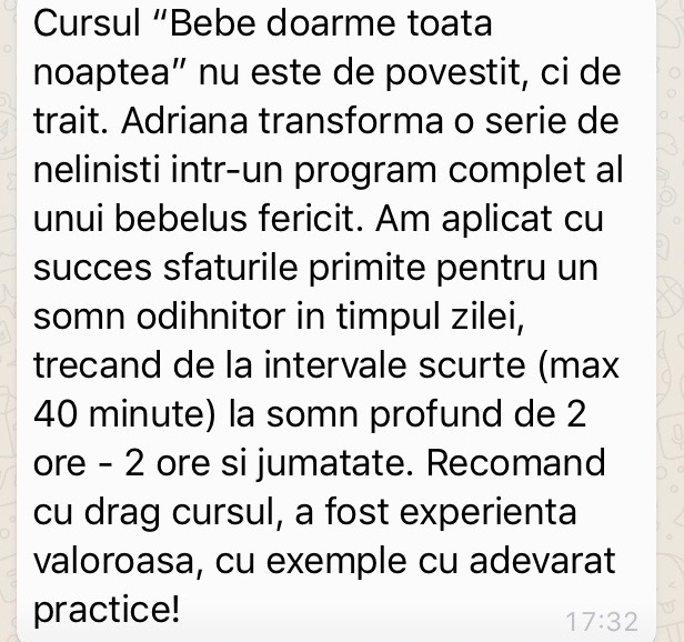 Buna Ela, totuși pentru mămicile care din anumite motive fie ca este prea departe, fie ca suntem in alta tara(motivul nostru ) nu putem ajunge, nu poți sa ne spui și noua mici trucuri? Urmăresc video-urile tale și articolele dar nu găsesc nimic concret. Într-adevăr experiența primului copil nu este ușoară, fetița mea având 5 luni , când ma uit in urma chiar dacă nu este așa mult timp simt câteodată ca copilul meu defapt nu este agitat/rău/ plângăcioas sau cum l-or numi alții ci poate doar eu i-am transmis aceasta stare nefiind destul de calma și atenta la nevoile ei. Din inima mi-aș dori sa faci mai multe articole”bebe doarme toată noaptea”. Cu stima di respect, Daniela.