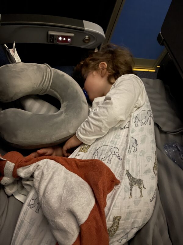 Le-am scos telefoanele, el s-a uitat la desene, iar Alesia s-a jucat. Liniște și pace, nu-mi venea să cred. După ce s-a servit masă am scos pernele și le-am mărit locul. Aproape că le făcusem un pătuț. Pe la ora 9.30 l-am pus în sacul de dormit, i-am dat jucăriile de somn și suzeta și am sperat că o să adoarmă ușor. Știți că el doarme singur în camera, în întuneric și liniște. M-am întins lângă el, l-am luat în brațe și, încă o dată spre surprinderea mea, a adormit relativ repede. Ceva mai târziu a adormit și Alesia. Erau așa drăgălași în pătuțul lor improvizat. S-au trezit când am aterizat, puțini obosiți având în vedere ora, dar le-a trecut repede când am ieșit din aeroport.