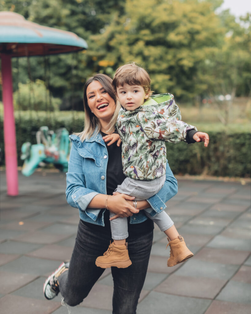 Când Bibi a început să meargă, eram cea mai fericită că pot să îi fac ținute. Îmi plăcea să-l îmbrac frumos, elegant, cu blugi, cu salopete. Nu mă gândeam neapărat la comoditate, adoram să îl văd frumos îmbrăcat. Foarte multe dintre discuțiile cu mama mea erau pe această temă pentru că de câte ori veneam de la cumpărături sau mă vedea că ies cu el din casă îmi spunea: „Hainele astea nu sunt comode! Un copil trebuie să fie comod! Comod, comod, comod”. Dar nu am ascultat-o… Ne-am împărțit cumva: ea îl îmbrăca comod când era cu ea, eu îl îmbrăcam elegant și frumos și la patru ace când era cu mine.