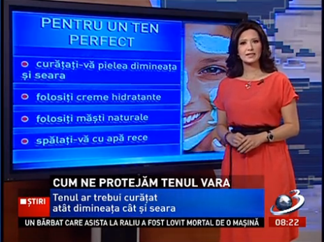 Vara,soarele puternic, praful, poluarea și lipsa hirdratării lasă urme pe tenul dumneavoastră. Pielea feţei va fi mai obosită, mai uscată, mai lipsită de vitalitate. Pentru a avea un ten perfect acordaţi atenţie, în primul rând alimentaţiei, dar şi felului în care vă hidrataţi. Aveţi grijă să vă curăţaţi fața în fiecare seară. Chiar dacă nu folosiţi produse de make-up, pielea trebuie să respire şi are nevoie să fie curăţată, apoi folosiţi creme hidratante, în funcţie de tipul de ten pe care îl aveţi.