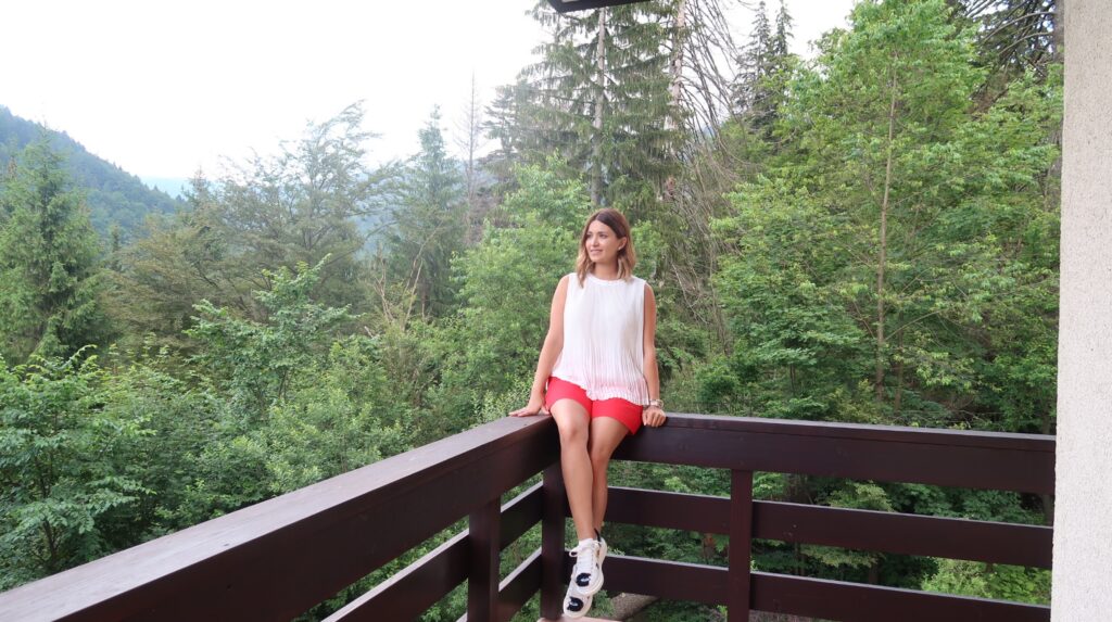 În prima zi am făcut yoga și streching pe gazonul de pe terasa hotelului Belvedere Sinaia, în mijlocul pădurii.