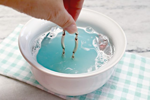 Se adaugă o lingură de apă de gură peste toate celelate și se amestecă foarte bine. În lichidul rezultat se adaugă bijuteriile pe care le lăsăm să se odihnească pentru 10 minute.