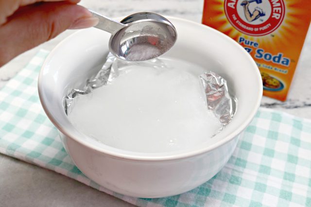 În primul rând puneți folia de aluminiu pe fundul vasului. Adaugă peste ea o cană de apă caldă. Apoi pune o lingură de bicarbonat de sodiu și una de sare.