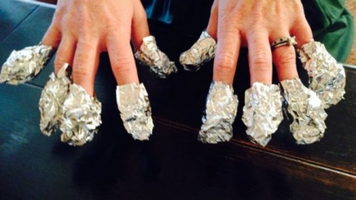 Începeți prin a rupe 10 bucăți de folie din staniol de dimensiune medie, astfel încât să vă puteți împacheta degetul din jur împrejurul unghiei. Biluțele de vată le îmbibați în acetonă sau dizolvant. Apoi le aplicați pe unghie. Împachetați bine unghia cu tot cu vată în staniol. Aveți grijă ca vata să nu se miște când aplicați staniolul. Ea trebuie să rămână pe unghia colorată timp de 10-15 minute.