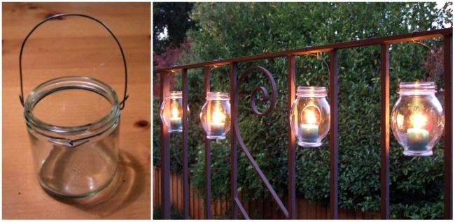 Prindeți sfoara din jur-împrejurul gâtului borcanului. Trebuie să fie suficient de groasă încât să țină borcanul. Trebuie să lăsați o ață mai lungă reprezentând mânetul felinarului. Dacă aveți cu ce să îngăuriți borcanul stânga dreapta puteți încerca și așa. Puteți folosi niște sârmă tare pe care să o băgați prin găuri. Pe fundul borcanului puteți pune nisip și scoice și o lumânarre, sau doar lumâncarea care va transforma borcanul în felinar.