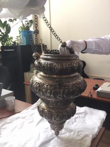 Această candelă, ce s-a dat la Sveti Gheorghie cel Nou, luminează locul unde odihnesc oasele fericitului Domn Io Constantin Brâncoveanu Basarab Voievod.