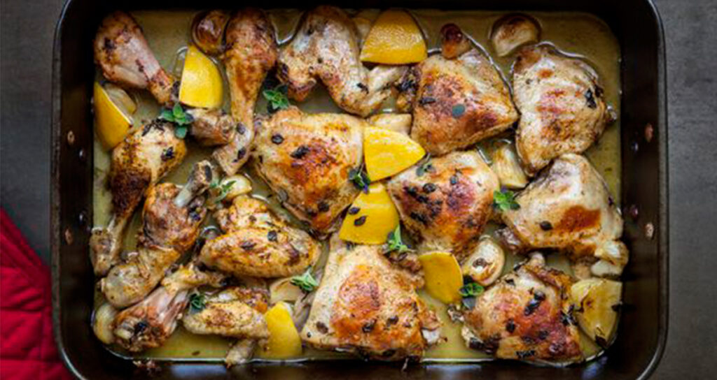 Preîncălzești cuptorul la 200 de grade Celsius. Se amestecă într-un bol vinul, uleiul și cimbrul. Se toarnă amestecul în tavă. Se condimentează bucățile de carne cu sare și piper, după gust. Le așezi în tavă, iar printre ele pui feliile de la cele 2 lămâi, dar și grăunții de usturoi. Lași la cuptor pentru 30-40 de minute. Se lasă la răcit 10 minute înainte de a le scoate din tavă pentru a le servii.