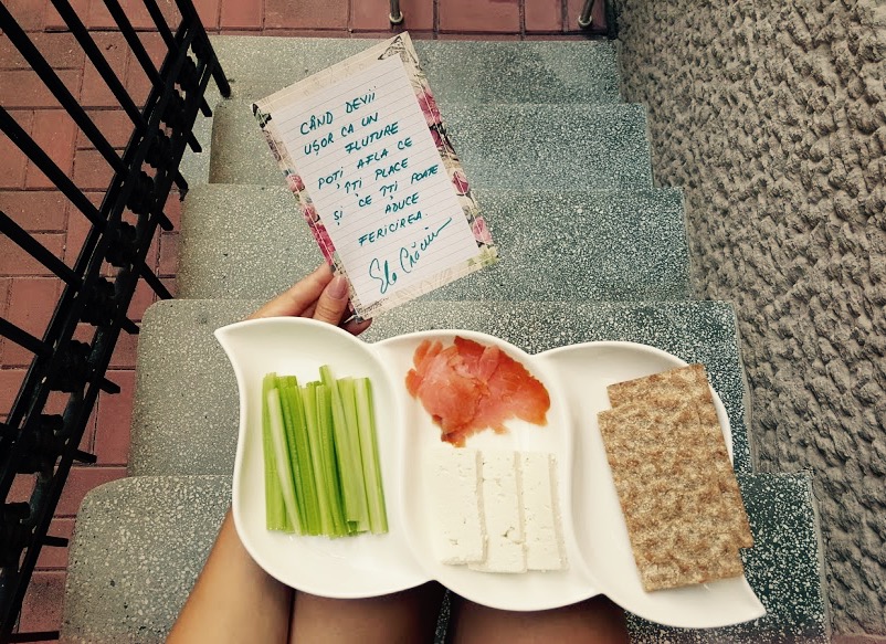 În această dimineață, am dat undă verde proteinei și am asamblat 3 felii de brânză proaspătă de capră cu 60-80 gr. somon marinat, m-am ajutat de 2 crackerși Wassa și de câteva tije de țelină apio. O formulă super-consistentă și cu care nu riscați nimic la capitolul siluetă. Simplu, frumos și bun. Acum 🙂