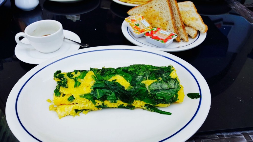Ei, una peste alta, în dimineața asta am revenit la proteina sănătoasă, combinată cu verdețuri și, opțional, doar opțional, cu pâine prăjită și puțin gem. Deși m-a tentat, recunosc că nu am cedat tentației gemului. Am lăsat omleta să-și joace rolul și cafeaua să mă potolească. Şi am pornit la drum. Simplu, frumos și bun. Acum.
