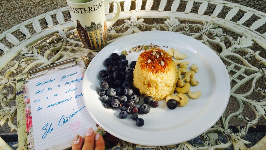 Ce am făcut: am fiert jumătate de cană de quinoa, pe care am amestecat-o cu semințe de in și scorțișoară. I-am dat o formă simpatică și am asezonat-o cu o ceașcă de afine și 10-15 caju (pe care le puteți, de altfel, măcina și presăra peste quinoa, însă eu am preferat să le mănânc că atare). E o combinație perfectă pentru o dimineață de duminică. Simplu, frumos și bun. Acum 🙂