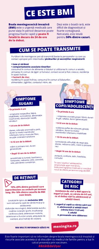 Vă las mai jos un infografic în care puteți afla mai multe despre boala meningococică invazivă și simptomele acesteia, dar vă invit și să discutați cu medicul vostru pediatru/de familie despre acest subiect, pentru că sunt sigură că vă vor ajuta informațiile lor la fel de mult cum m-au ajutat și pe mine.
