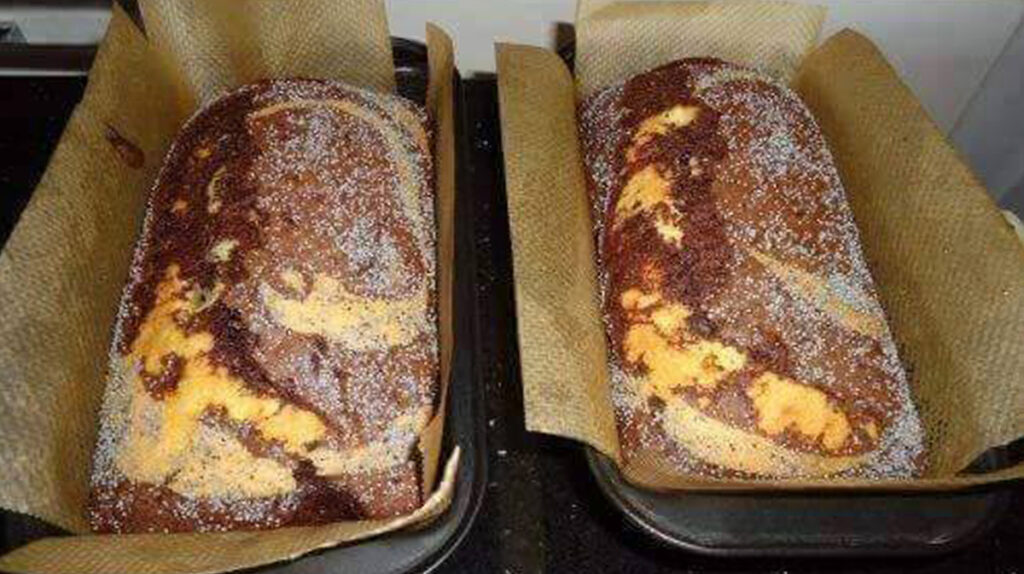 După ce ați pus aluatul negru pe deasupra, cu ajutorul unei furculițe amestecați astfel încât după coacere, chechul să arate șatirat. Dacă doriți puteți pune pe deasupra miez de nucă întreg sau măcinat. Cumporul trebuie să fie preîncălzit, însă nu încins. Adăugați tava la cuptor la foc mediu circa 45 de minute. În primele 20 de minute nu trebuie să deschim ușa de la cuptor.