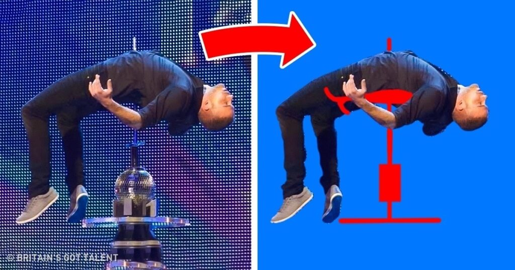 Trucul realizat de James More la Englezii au talent are o explicație simplă. Magicianul poartă o construcție specială pe sub haine. Când el cade pe sabia ascuțită. Vârful său se retrage și iese unul fals.