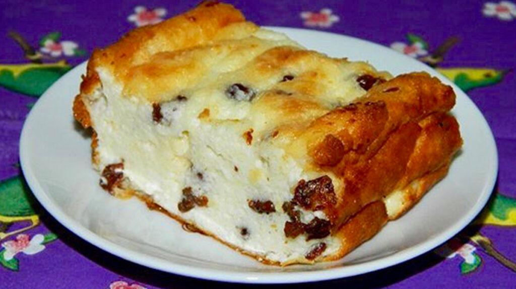 Se topește untul în baie de aburi. Tava pentru copt se tapetează cu jumătate din cantitatea untului. Adăugăm compoziția de brânză și stafide, iar pe deasupra adăugăm uniform unul topit. Se coace la temperatura de 180 de grade pentru 30 de minute. Se poate face și fără îndulcitor, stafidele fiind deja dulci.