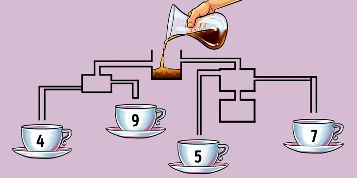 TEST! Care este cana care se umple prima de cafea. Mai întâi, uitați-vă la ilustrație. Există 4 căni, fiecare etichetată cu un număr. Cafeaua se toarnă în tuburi care trec peste cele 4 căni. Care dintre cupe va primi prima cafea?