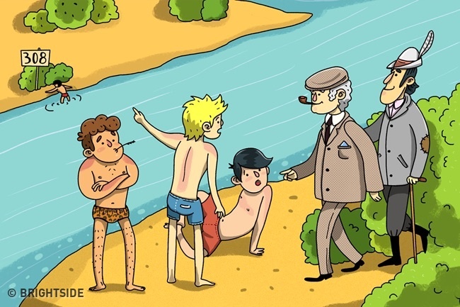 Inspectorul și asistentul său au văzut niște înotători, s-au apropiat de ei și le-au spus: „Căutăm un bărbat de vârsta voastră. Trebuie să fie prin apropiere. L-ați văzut?”
