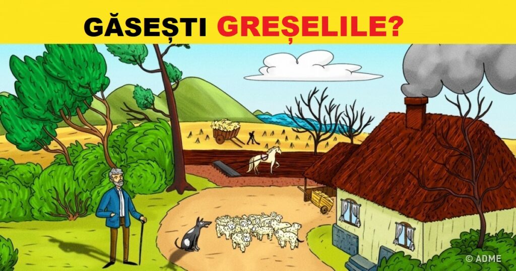 Sfat: Pune accent pe logică când te uiți imaginea și privește-o ca fiind cât mai reală. În imagine există multe detalii mici care nu pot fi la fel în realitate (a se vedea, de exemplu, anumite detalii pe terenul din spate). Imaginează-ți că ești chiar acolo și încearcă să găsești cât mai multe erori prin raționament logic. După ce te-ai străduit o vreme singur, poți verifica răspunsurile.