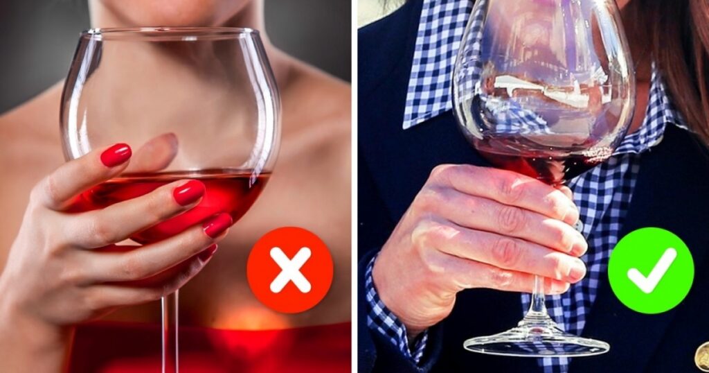 Ar trebui să ții paharul de vin numai de picior, ca să nu se încălzească lichidul. Dacă ai ruj pe buze, încearcă să atingi paharul într-un singur loc, pentru a nu lăsa un inel de ruj pe marginea paharului.